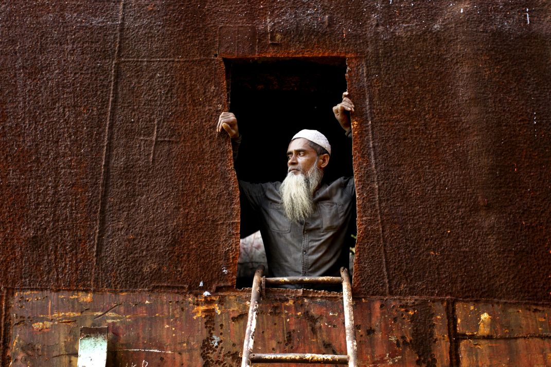 A Bangladeshi worker to make repairs to a large ferry, at a dockyard on the river bank of Buriganga, Dhaka, Bangladesh, At least twenty-eight dockyards occupying 30.96 acres of the Buriganga shore have been in operation without proper safety measures and guidelines. The waste and chemicals from the repairs pollute the river