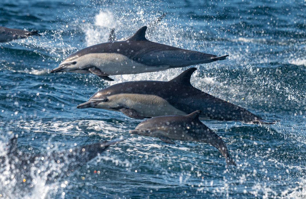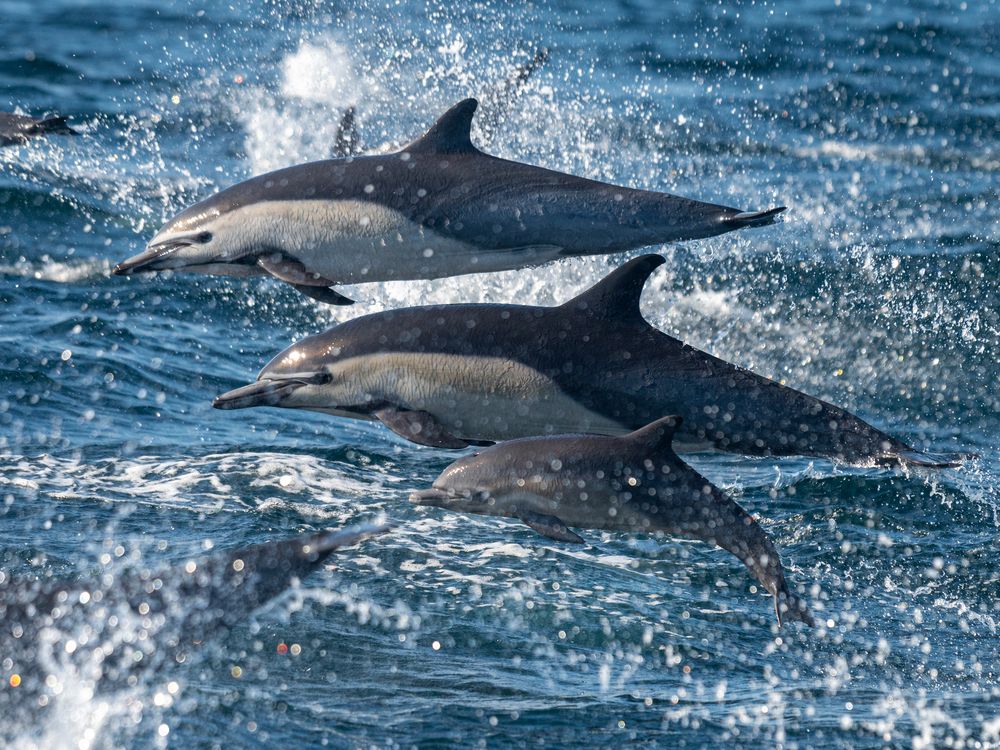 While on a pelagic birding expedition off around the Channel Islands, a fair distance from the coast, the largest dolphin pod I'd ever seen swam past our boat. These were common dolphin, and they were playing in the waves as dolphin often do. This particular photo captured in mid air what appears to be a dolphin family jumping unison. It was indeed a perfect acrobatic choreography. One would think the parents were teaching their baby how escape the ocean and fly through the air, even if briefly. It was pretty amazing to watch.