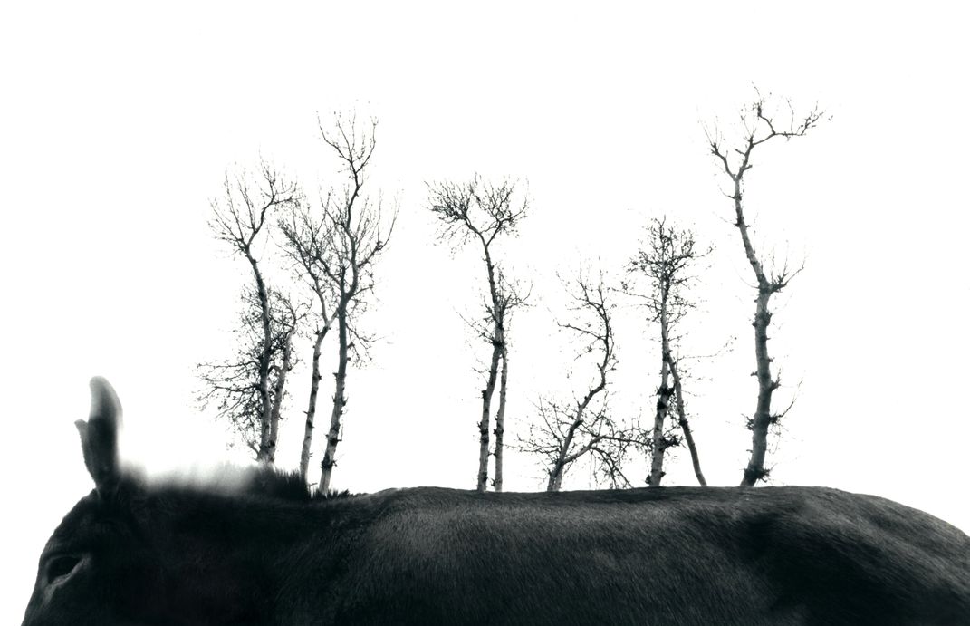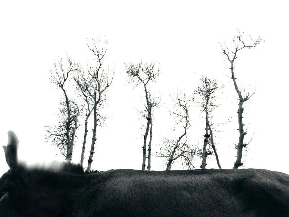 a donkey in front of trees