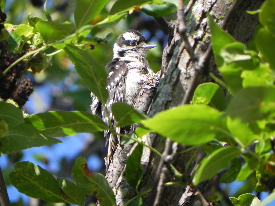 A downy woodpecker basking in the sun.