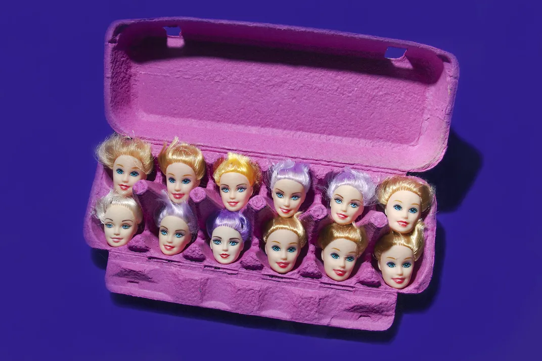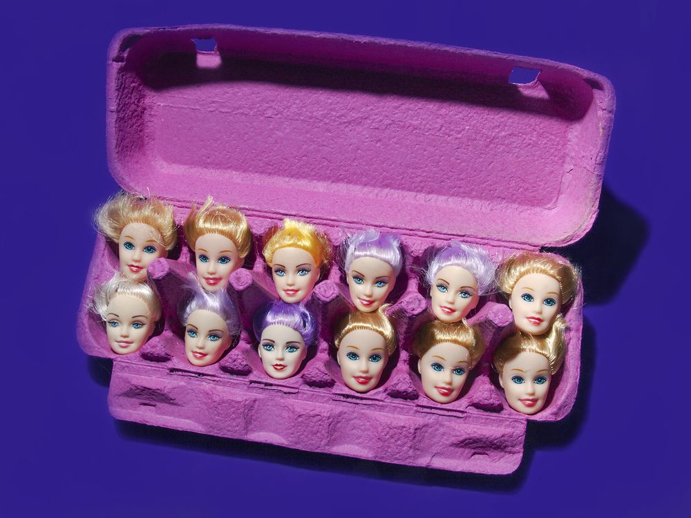A pink egg carton holds 12 doll heads like eggs, each with unique hair, suggesting a surreal play on mass production and identity.
