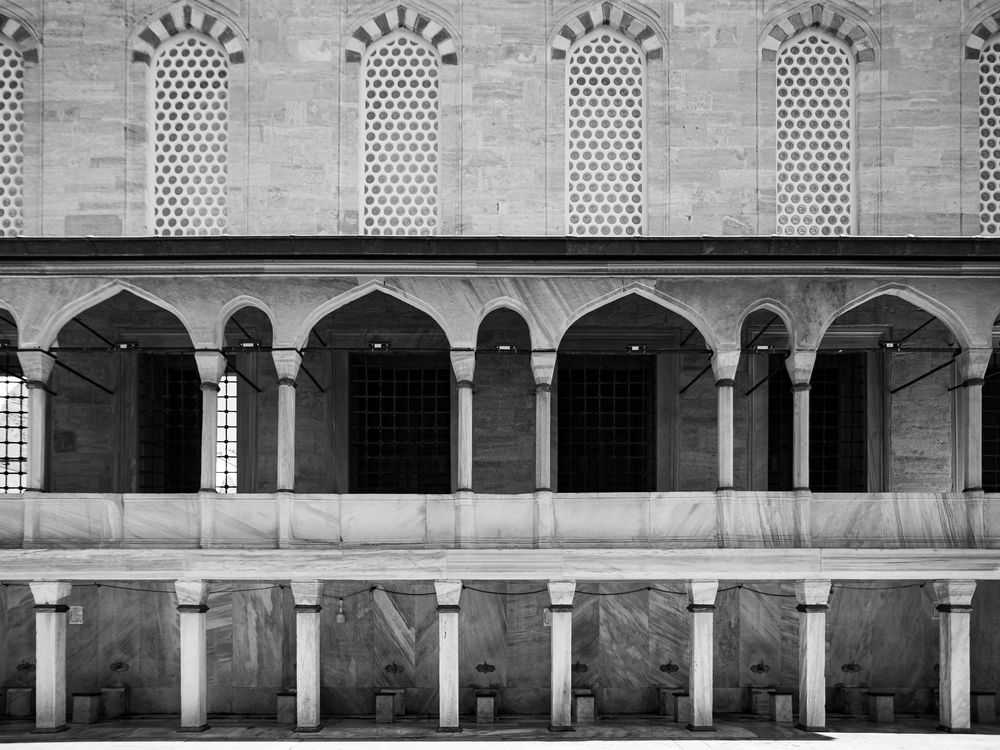 This Façade is a study in divine geometry and layered light. From the fully illuminated duotone arched windows closed with circular pattern down through mid-tone arches to the shadowed basins below, each tier diminishes in proportion. It is a silent, structural symphony where light itself becomes the measure of sacred space.