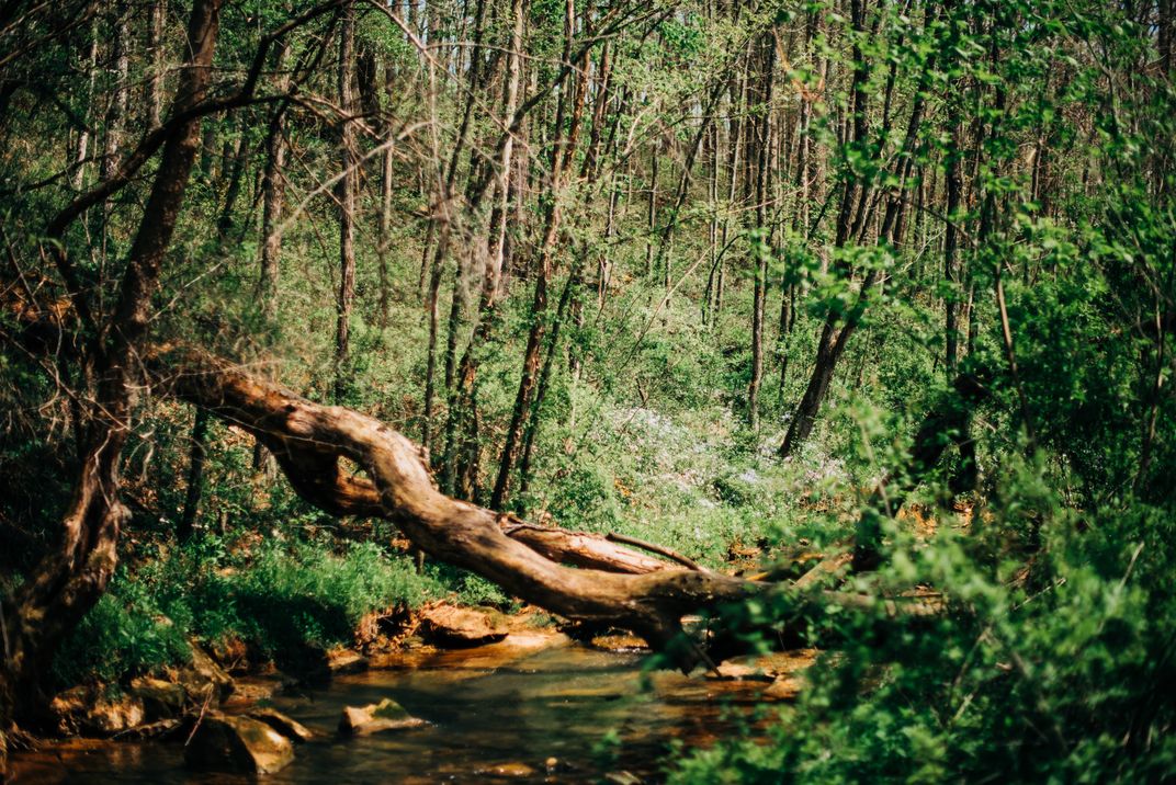 This is a photo of a creek with a fallen tree across it in the summer with wildflowers.