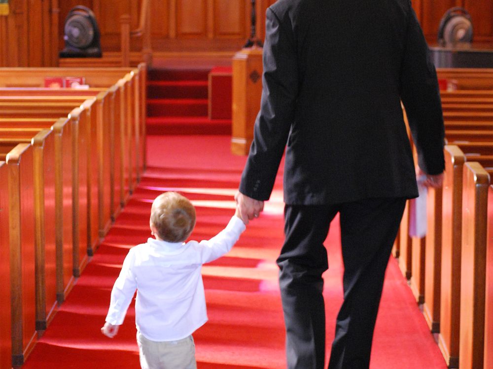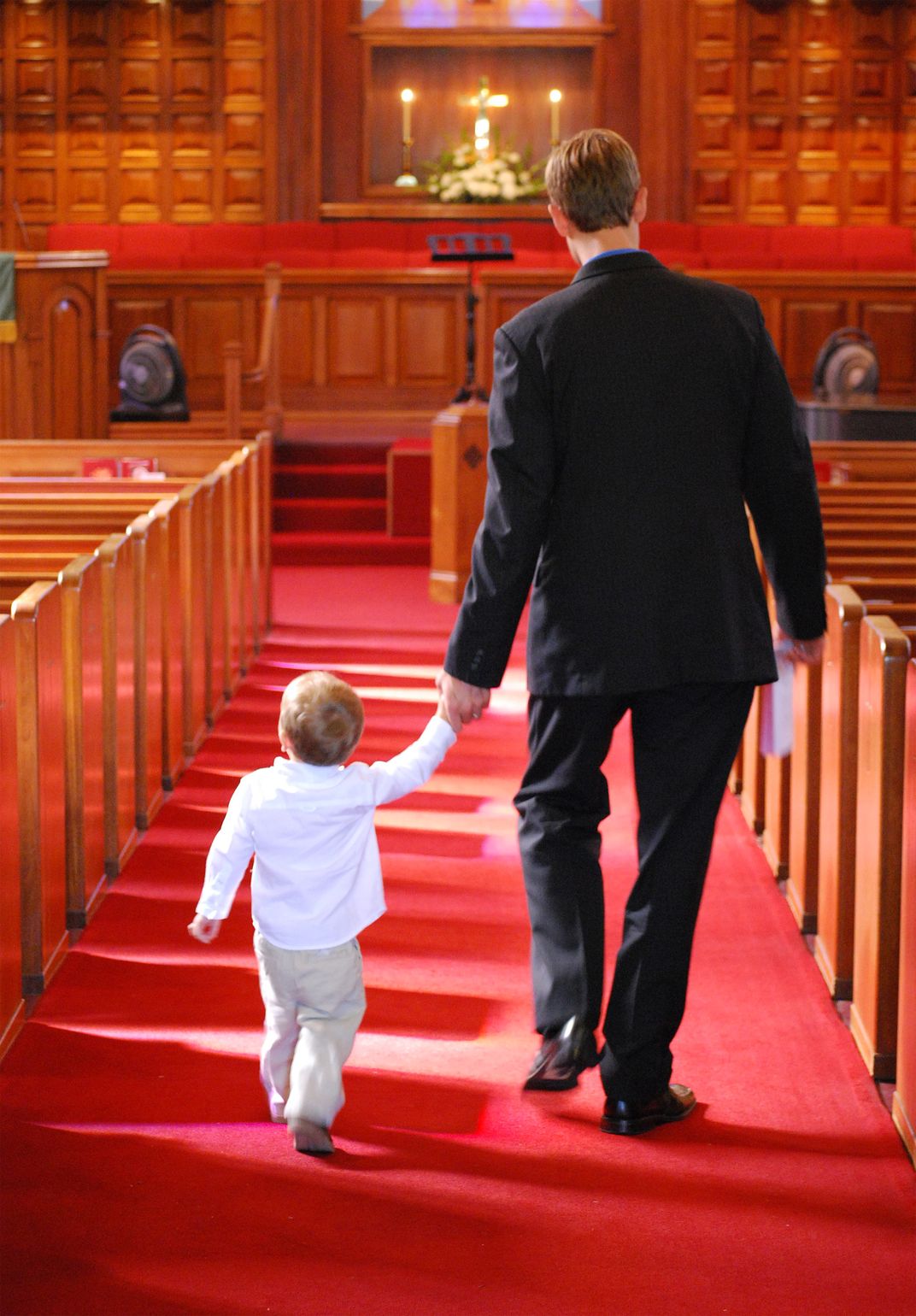 A father and son in church.