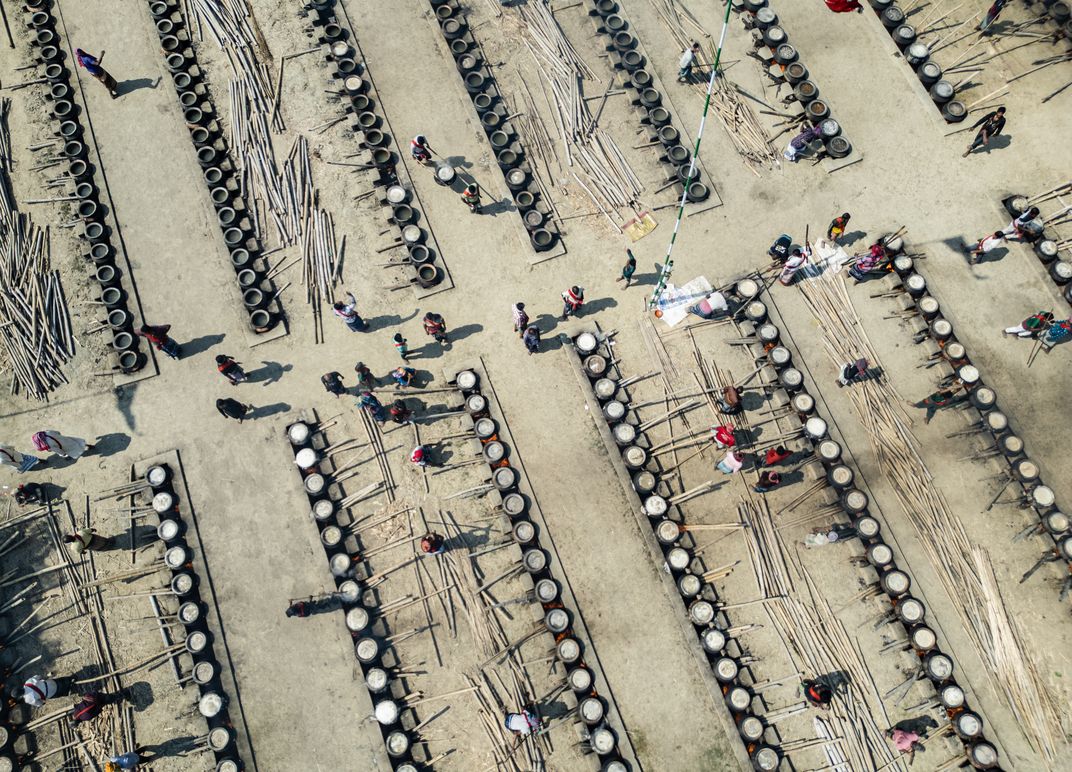 This aerial view shows an extraordinary scene of communal cooking in Bangladesh, where rows of giant cauldrons bubble with food prepared for thousands of people. Such large-scale cooking is a long-standing tradition during religious gatherings, village feasts, charity events, and weddings. Using wood-fired stoves and long bamboo paddles, teams of cooks stir massive pots of rice, lentils, and meat, creating meals that will be shared by entire communities.