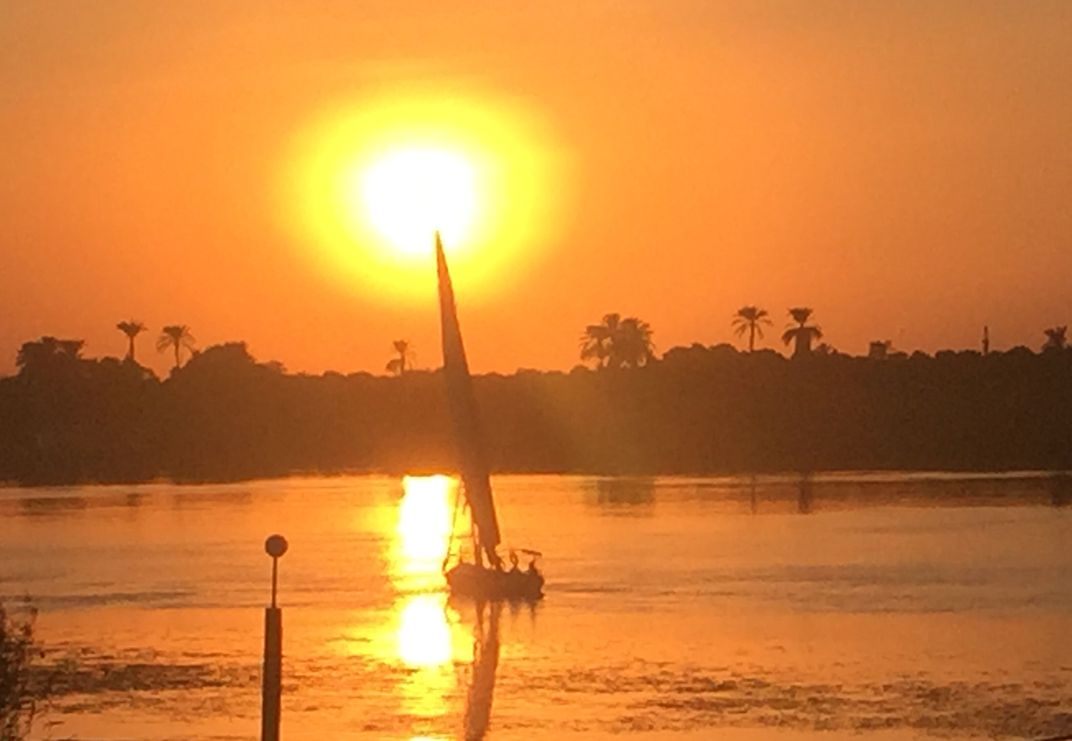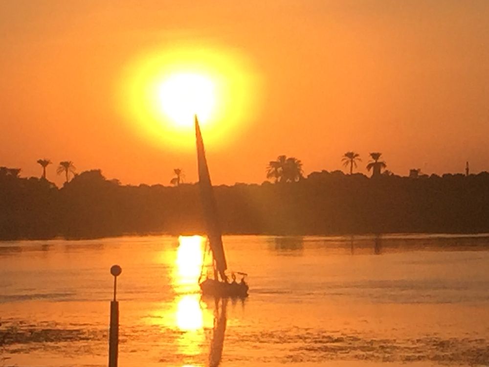A felucca sailing down the Egyptian Nile during sunset. The sunset is seen from King's Island near Luxor, Egypt.