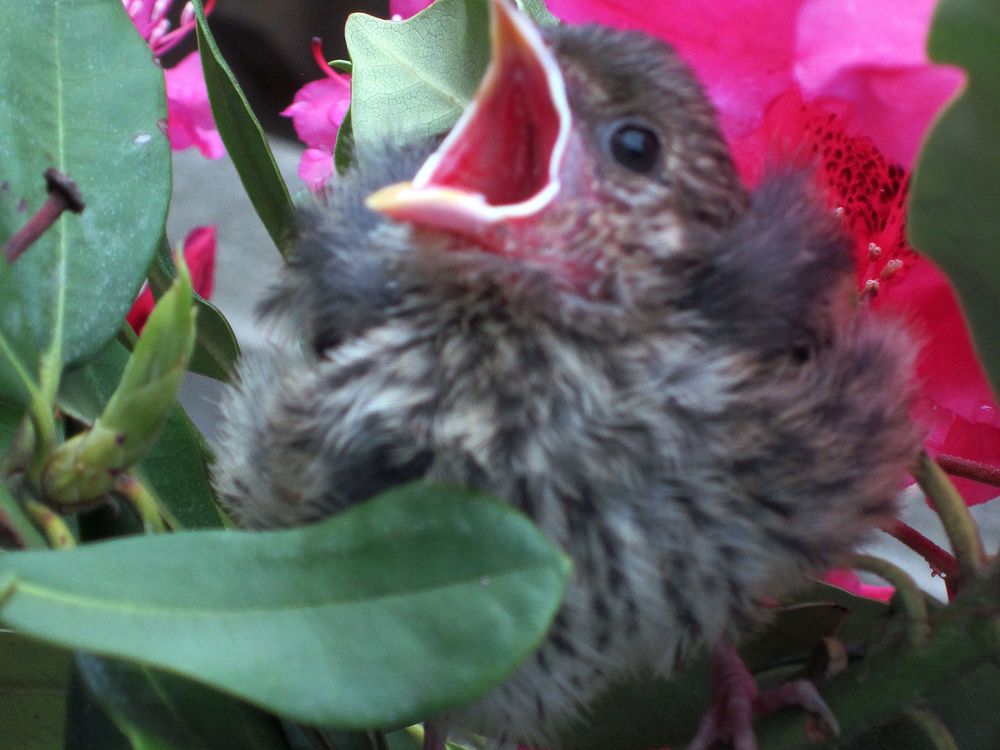 A fledgling bird opens its beak wide in anticipation of a juicy grub. The inside of its throat matches the rhododendron blooms behind it.