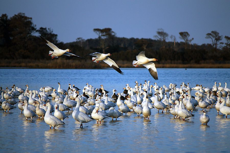 A flock of migrating geese during dusk on Chincoteague Island, Va.