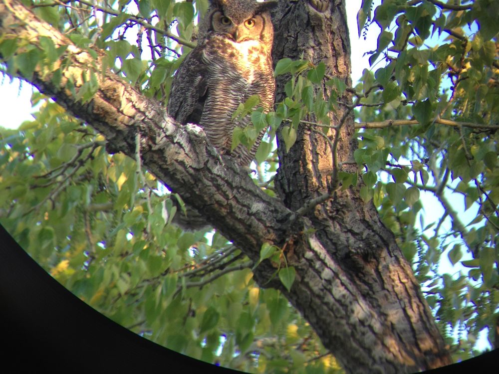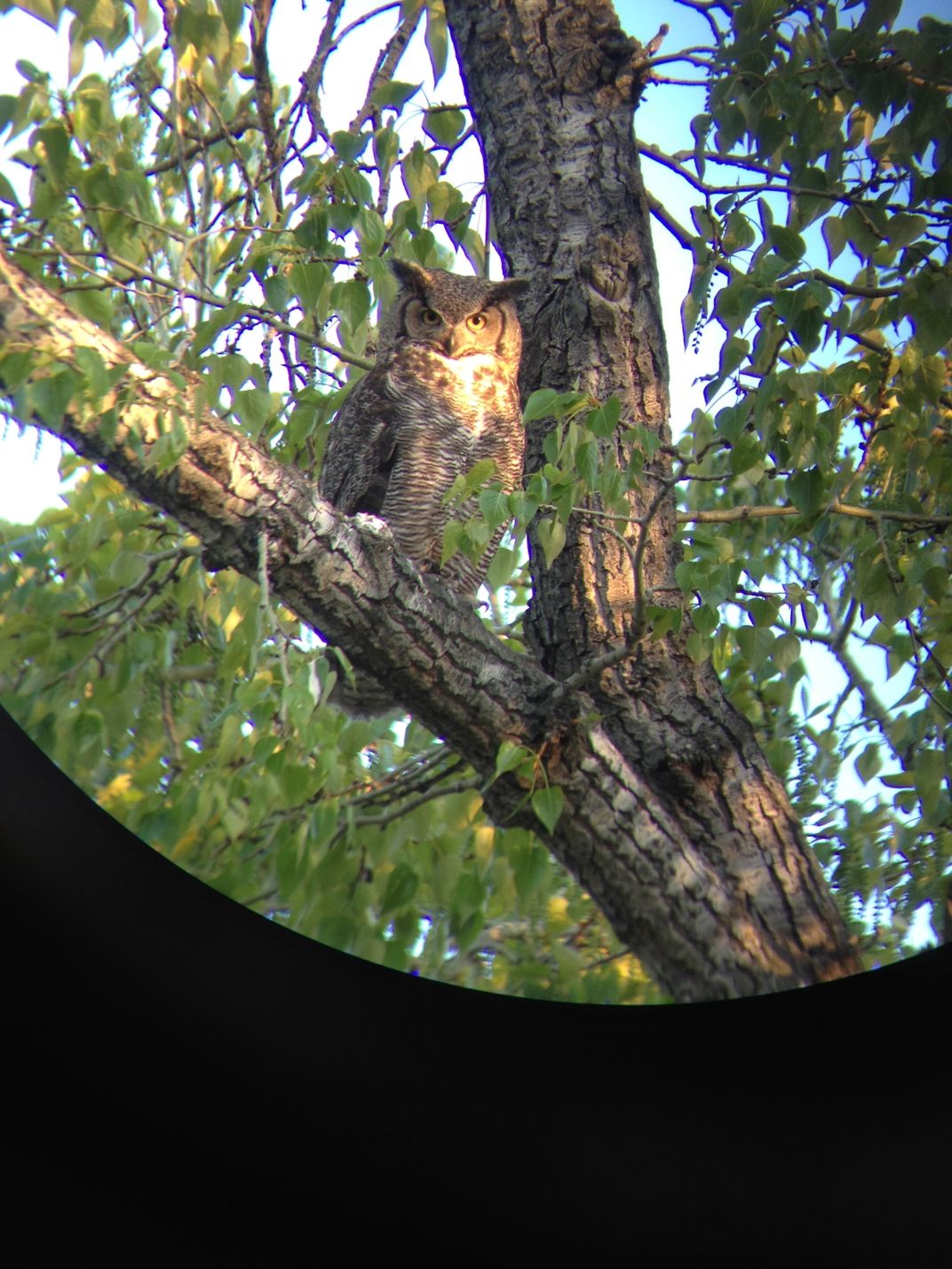 A friend of mine spotted a family of owls in a park near his house, so we decided to go watch them at dusk, when they're most active. I put the lens of my iPhone camera up to the lens of my telescope to get this close-up of the adult male.