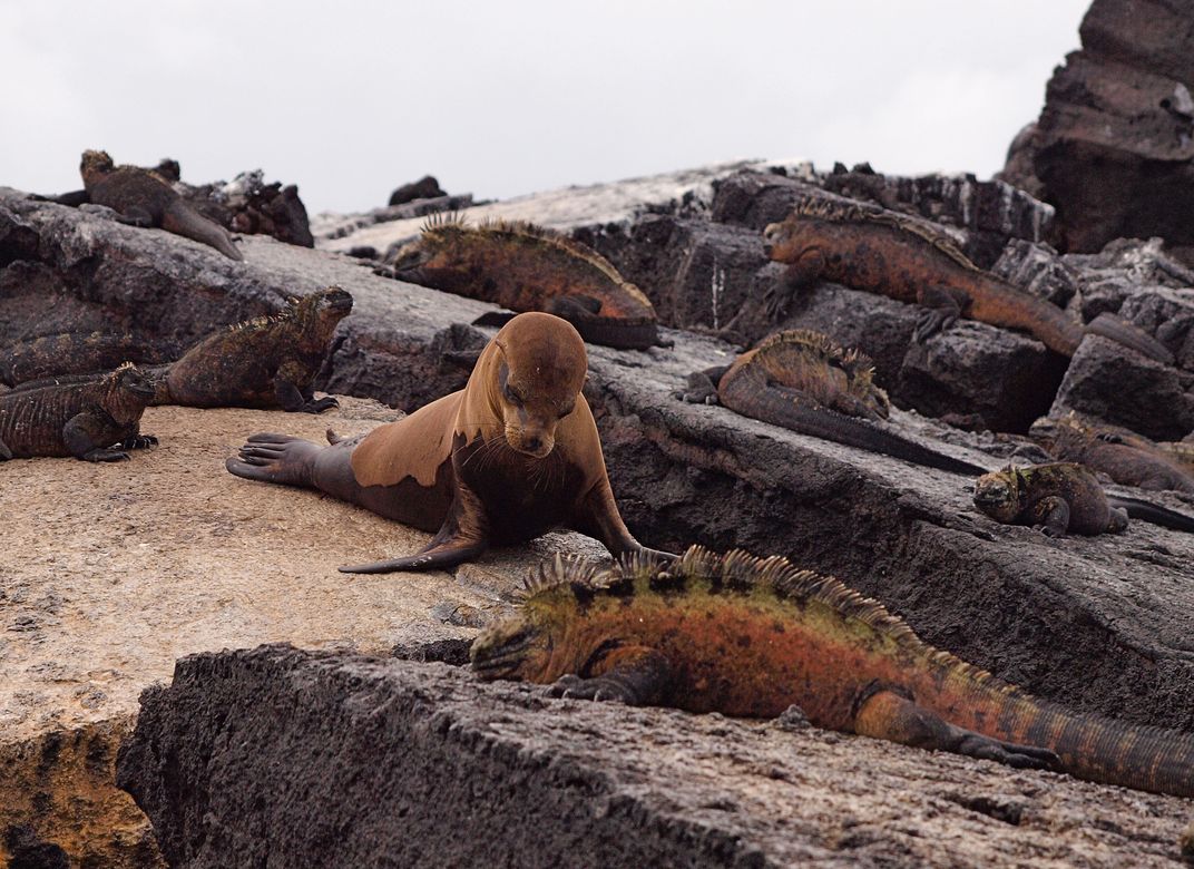 A Galapagos sea lion experiences a moment of species confusion surrounded by marine iguanas.