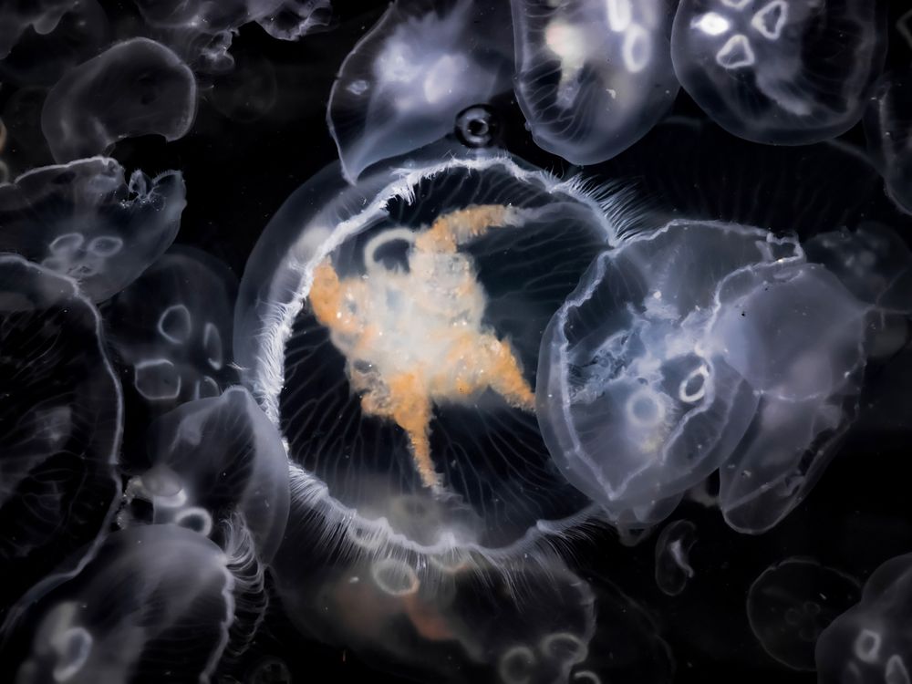 A large group of Jellyfish gathered together and created a special beauty. It happened on a cloudy day, its beauty shining like a galaxy.