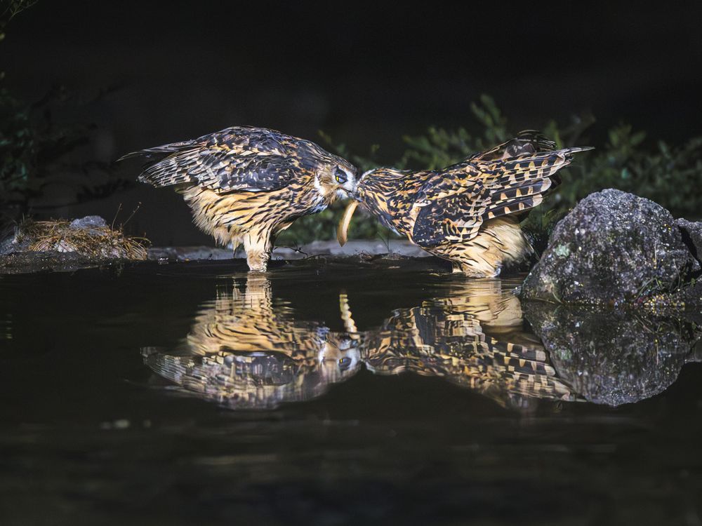 November 3, 2024 — During the raptor mating season, a male Brown Fish Owl with yellow legs is seen feeding a fish to the female. This precious moment has been captured for the first time in years.