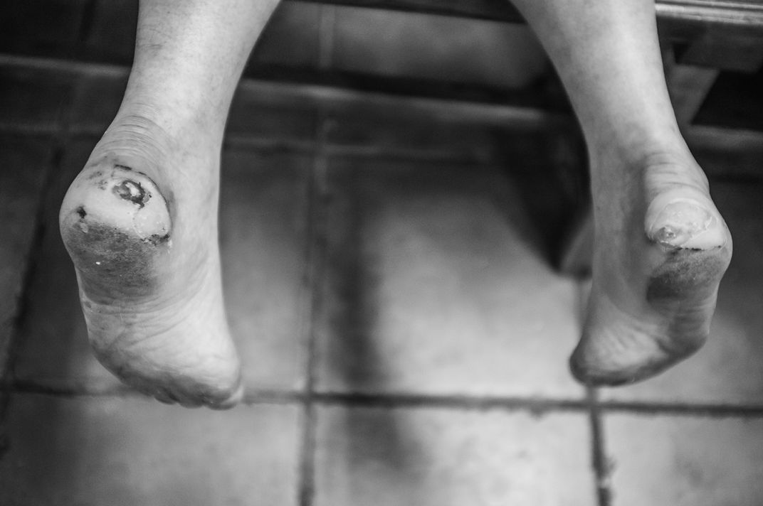 A German woman shows her feet, damaged after 1000 kms of walk, on her way to Santiago de Compostela