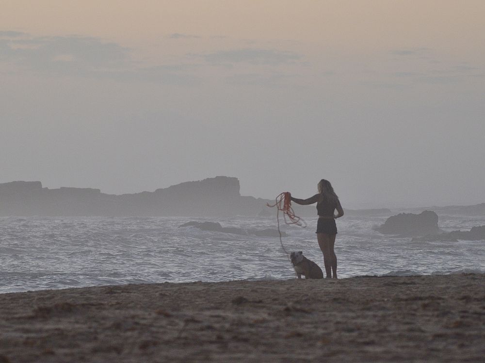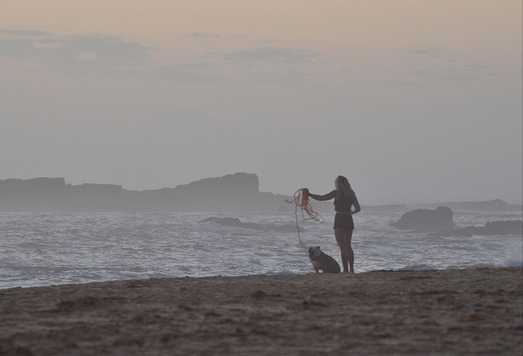 Dawn at the beach. I saw this girl and dog enjoying their walk. The dog just happened to notice me so I took a candid photo.