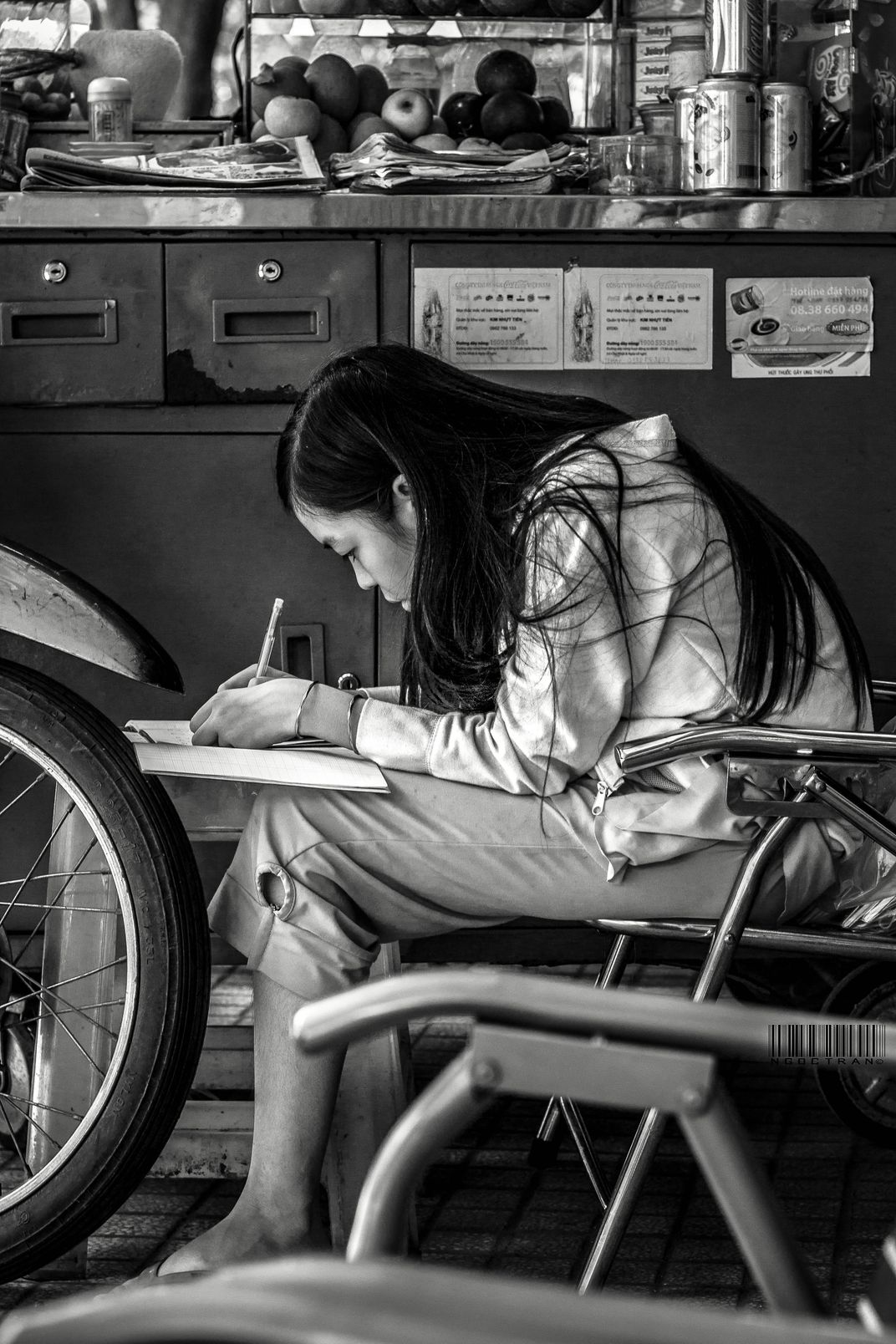 A girl hard at work with her homework on her down time from helping her mom out at their fruit cart.