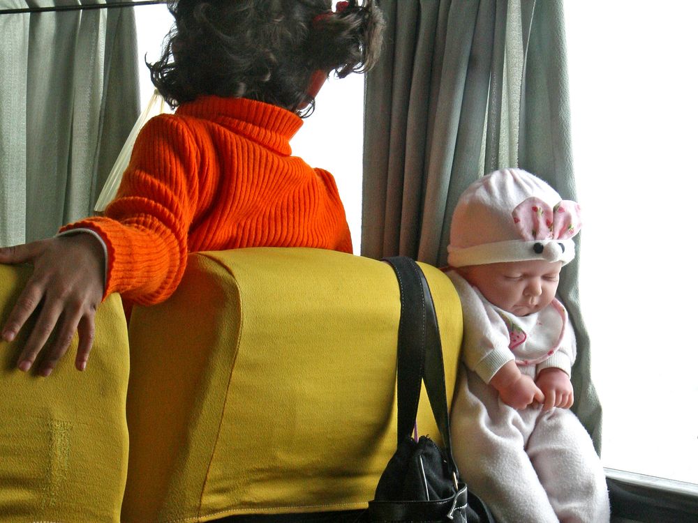 a girl watches outside from window of bus