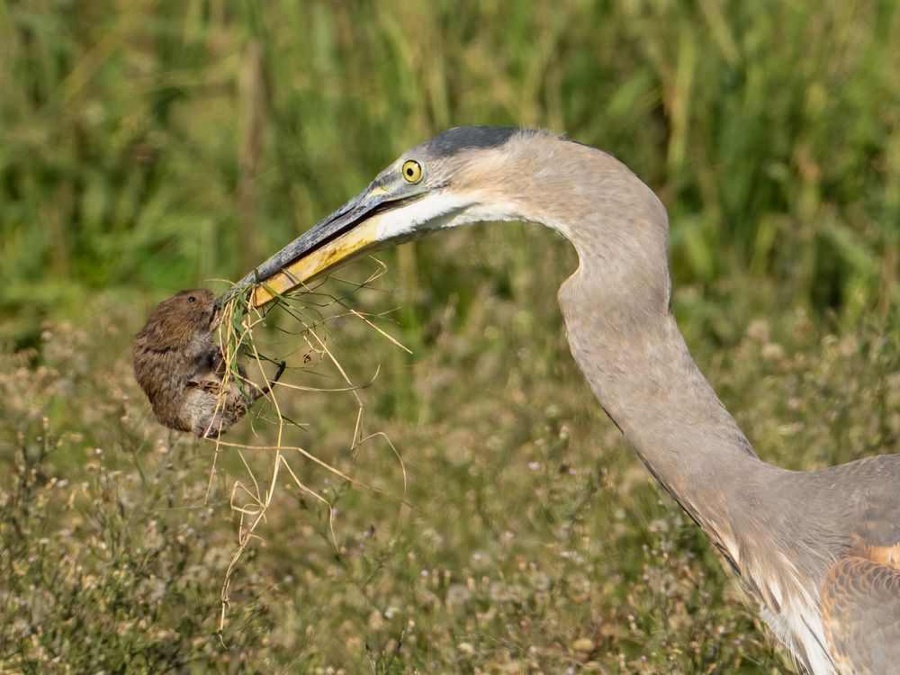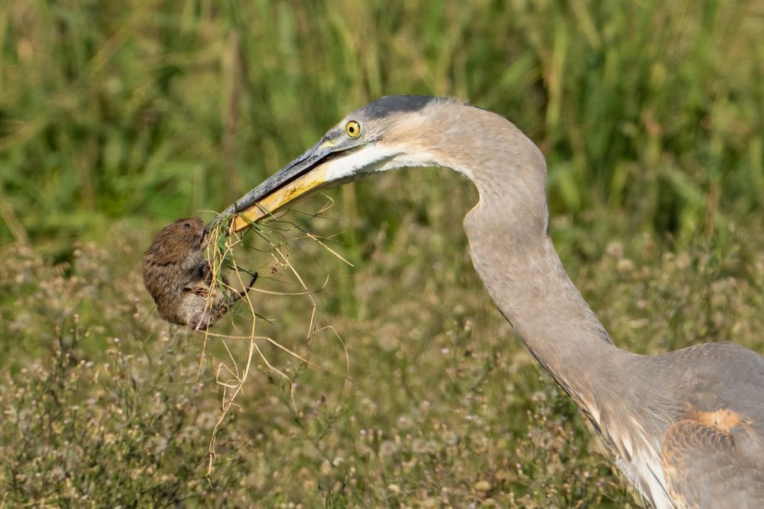 A Great Blue Heron snags a small gopher which struggled mightily for its life, but the outcome of this small saga was never in doubt.