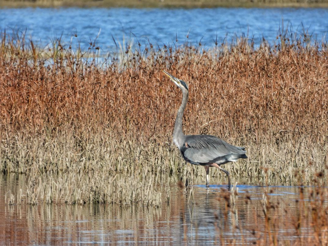 This is a great blue heron in Skagit County, Washington. They have slow purposeful movements in the water.