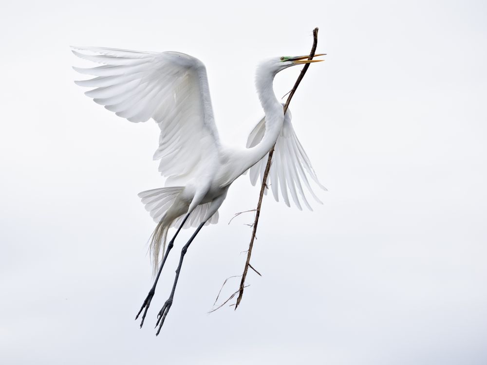 A Great Egret flies with a long stick clasped in its bill, wings sweeping in a bright arc as it returns to the rookery. The lifted feathers and trailing legs emphasize the grace and determination of a bird building its nest high above the wetland.