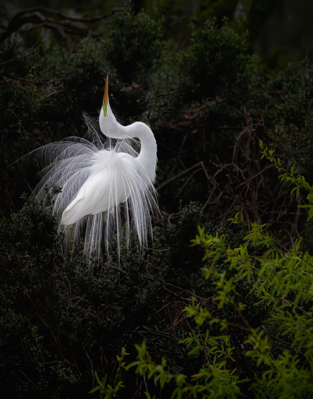 A Great Egret in breeding colors and pose doing neck stretches.