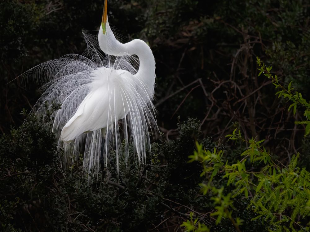 With a long graceful neck, during breeding season the patches on the Great Egret faces become a brilliant lime green, while their back feathers grow into lovely waving plumes. This is known as the courtship display of the great egret.