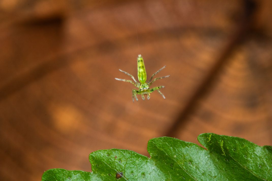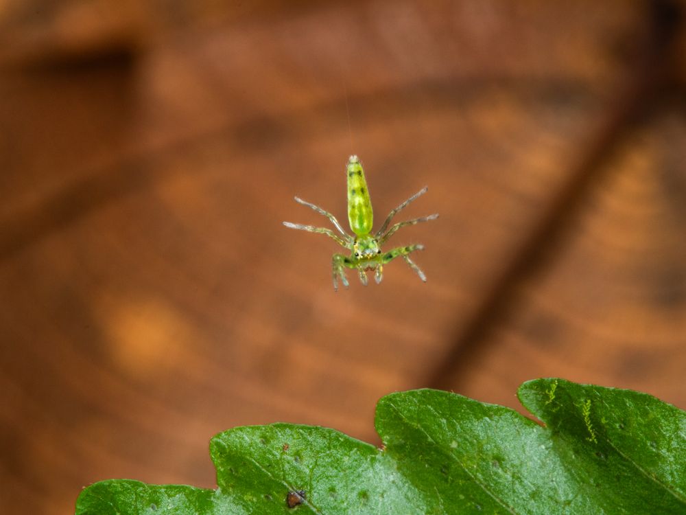 A large, ribbed, dry leaf provides the background to this green Jumping spider from the lowland tropical rain forest of Northern Costa Rica.