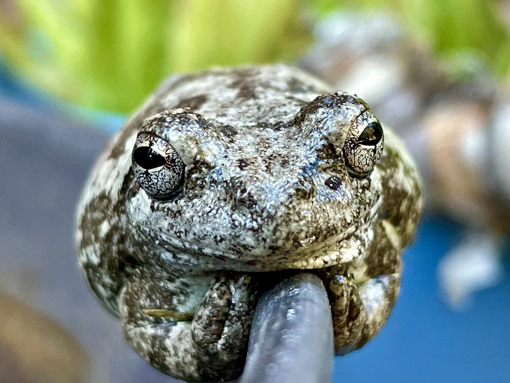 This is a picture of a Grey Tree Frog resting on a tub near my house.