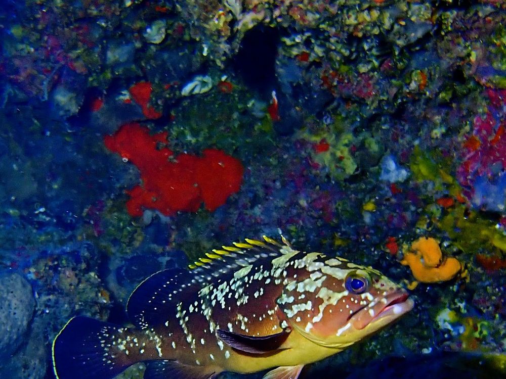A grouper in front of a wall full of corals, sponges and other sea creatures.