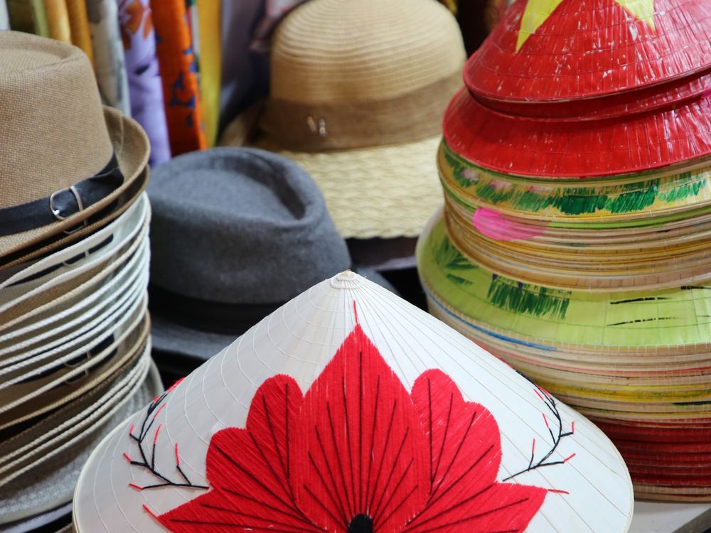 There are many souvenir shops along the streets of Hanoi's Old Quarter. This little shop displayed a variety of hats at its entrance. A uniquely patterned bamboo hat with a distinctive Vietnamese design caught my eye.