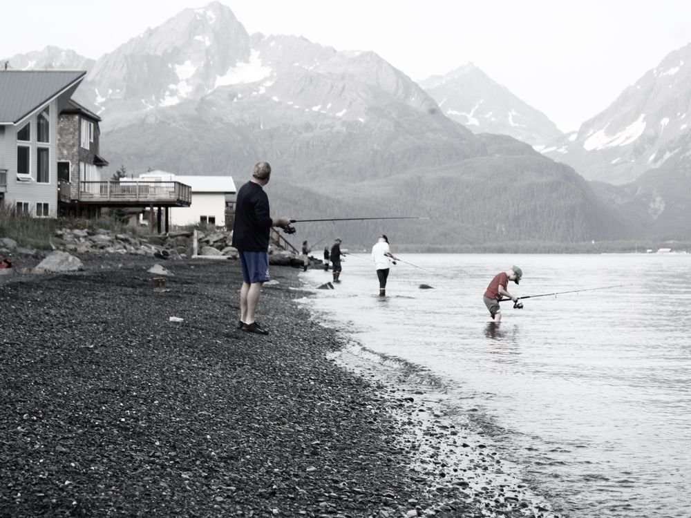 Two people, a boy and his dad, fishing on the banks of a water source in Seward, Alaska.