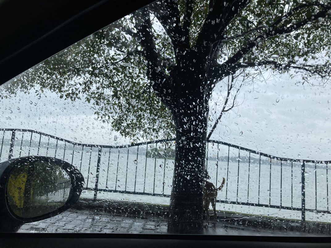 A hidden dog enjoying rainy weather.