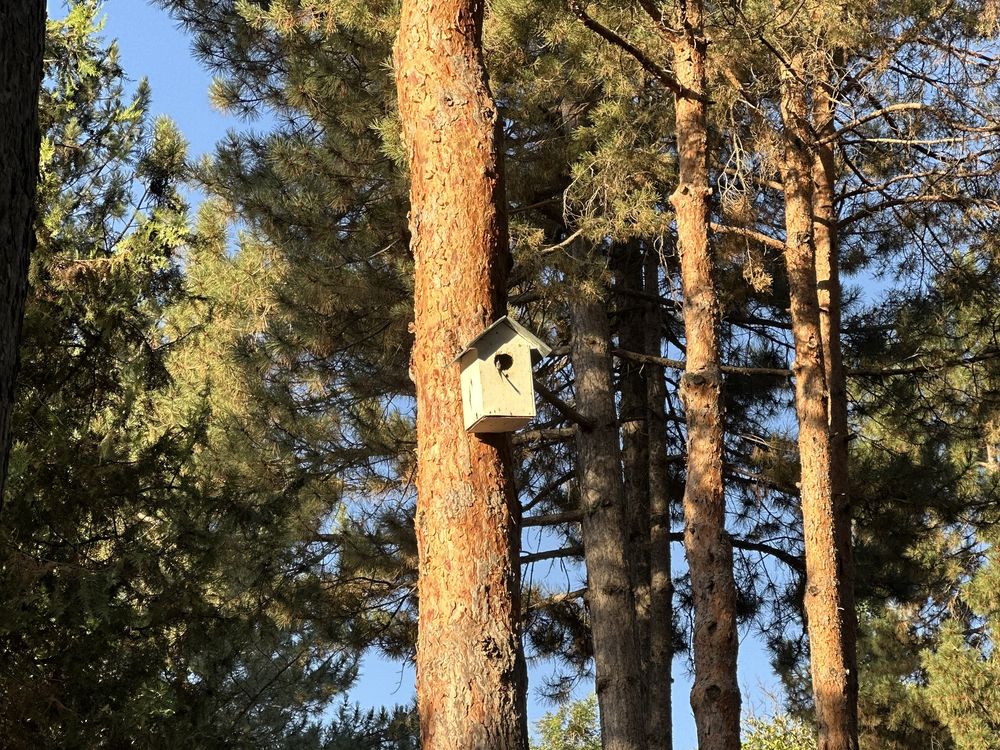 A single white house clings to a tall pine trunk, bathed in warm late-afternoon sunlight. Surrounded by towering pines and a clear blue sky, it offers a quiet refuge for small birds — a simple, peaceful home tucked high among the trees. Cozy home