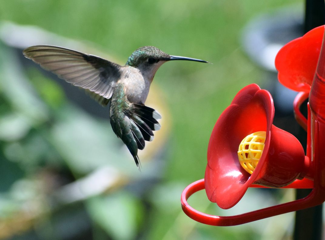 A green, black and white hummingbird flying near a red and yellow feeder with its wing and tail outstreched.