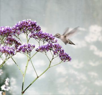 A hummingbird sips the nectar of purple flowers in a backyard garden