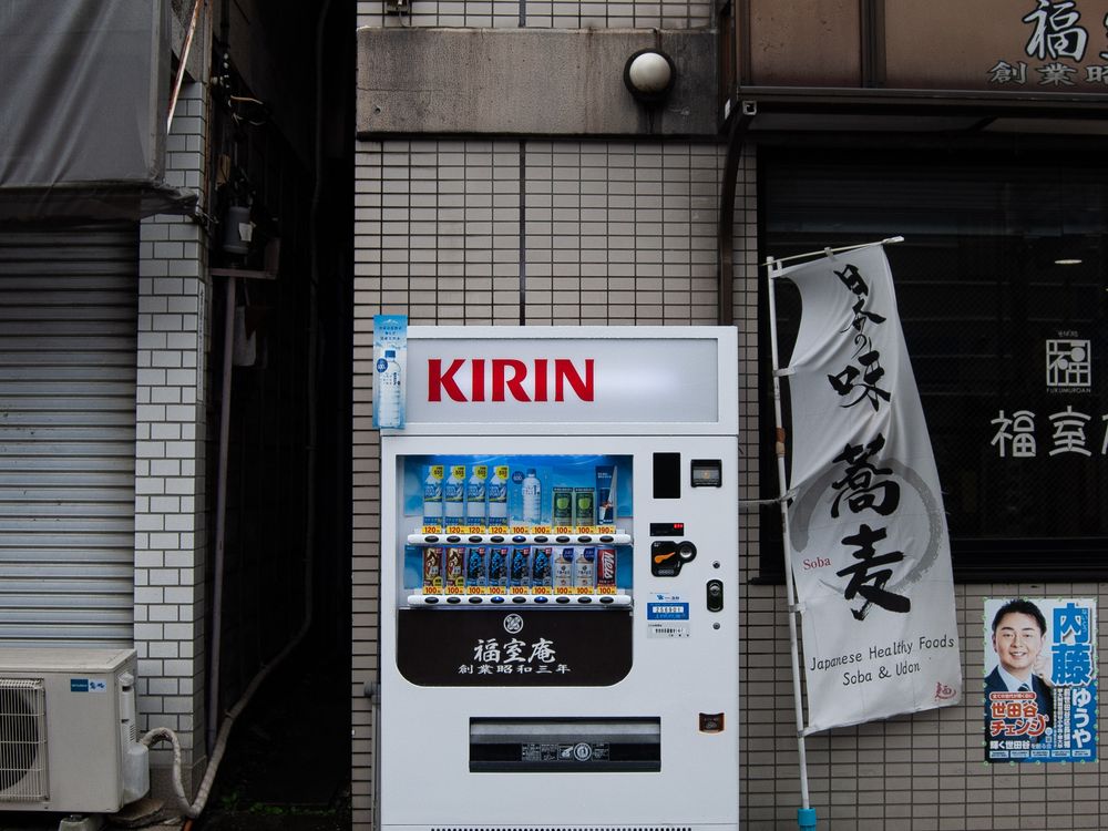 I was walking through the streets of Tokyo when I saw this vending machine. Although these machines are easy to find all over Japan, I liked this one because the white contrasted with the dark background behind it. I also like the Kanji displayed prominently on the machine, as well as the large sign next it advertising healthy soba and udon noodles, both staple Japanese foods. There is also an additional sign advertising a campaign for a local politician.