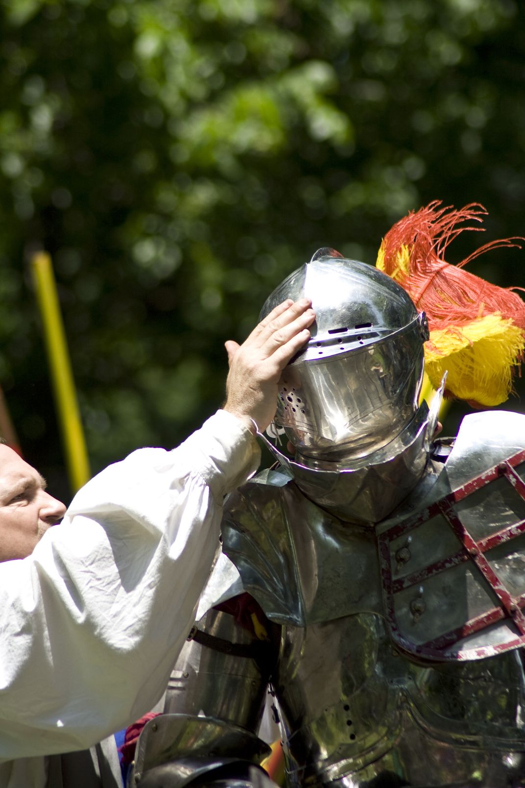 A jouster needs help suiting up at the Shakespeare and Friends Renaissance Festival.