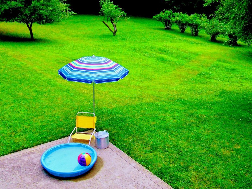 A Kiddie Pool and Umbrella near a Secluded Green Field of Fruit Trees