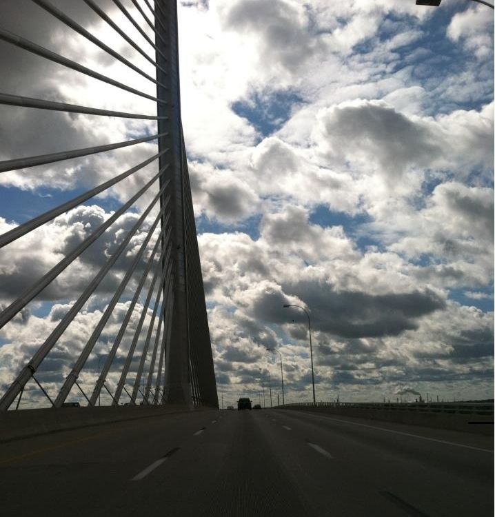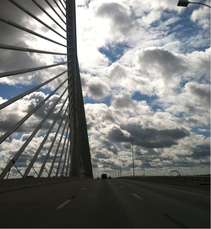 A late afternoon crossing over the Maumee River, Toledo, Ohio, on the (400' high, 8,800' long) Veterans' Glass City Skyway bridge.