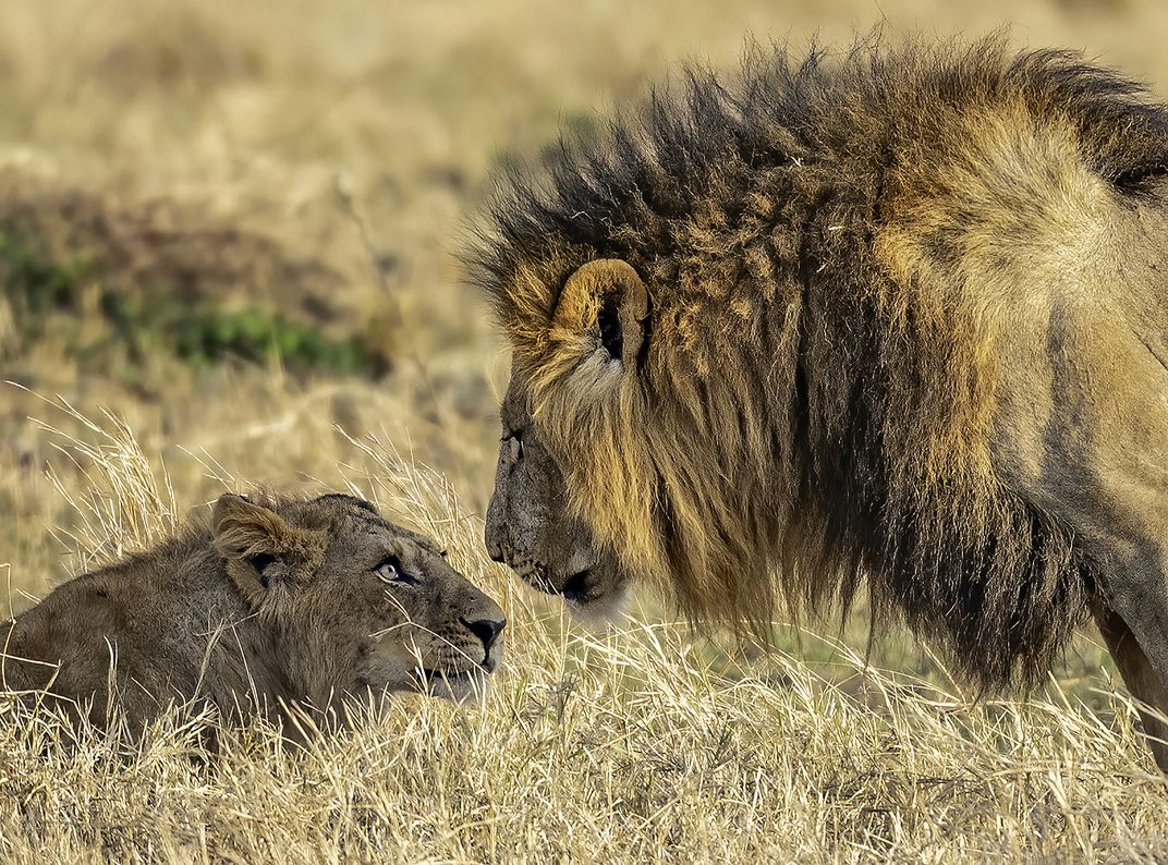 A lion cub approaches his father, the leader of the pride.