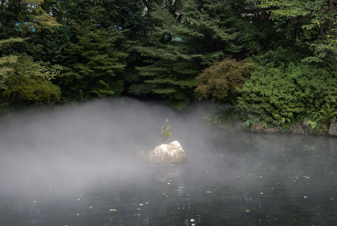 a lone plant surrounded by fog at the Four Seasons Kyoto koi pond