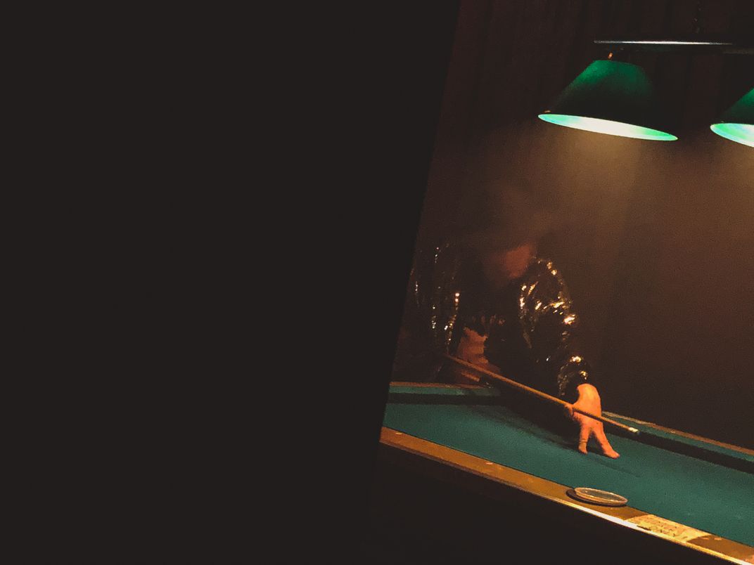 A window between the dark dance floor and the illuminated pool table room where this lone player practiced the game. Due to the lighting, he appeared to be our entertainer.