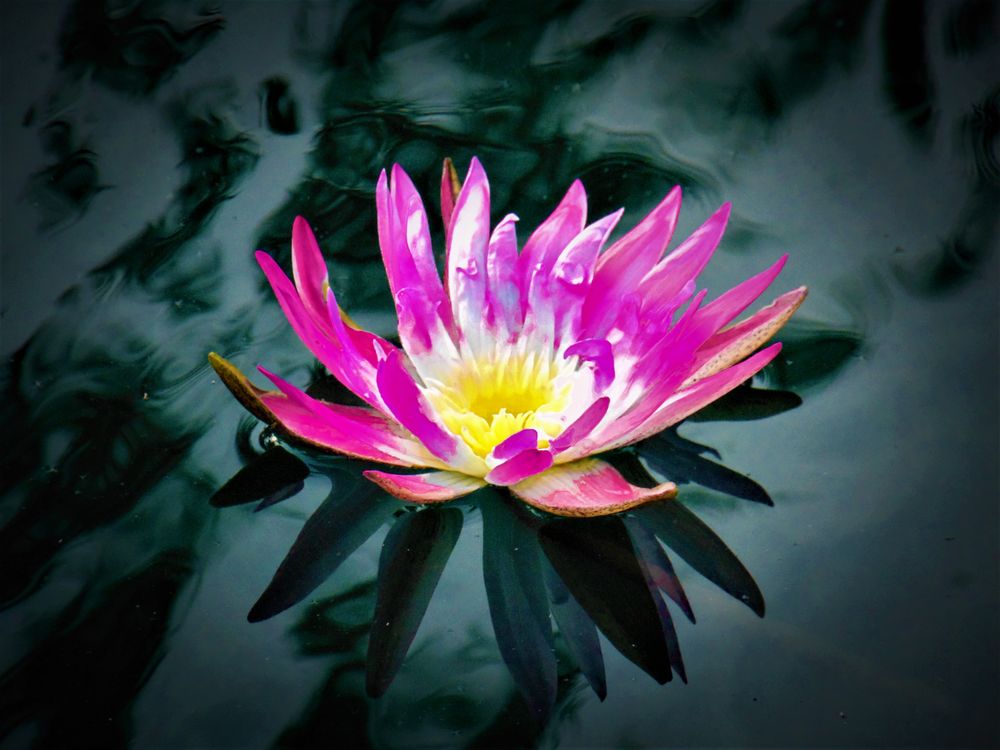 A singular water lily in the center a koi pond, where the fish were being rather coy.