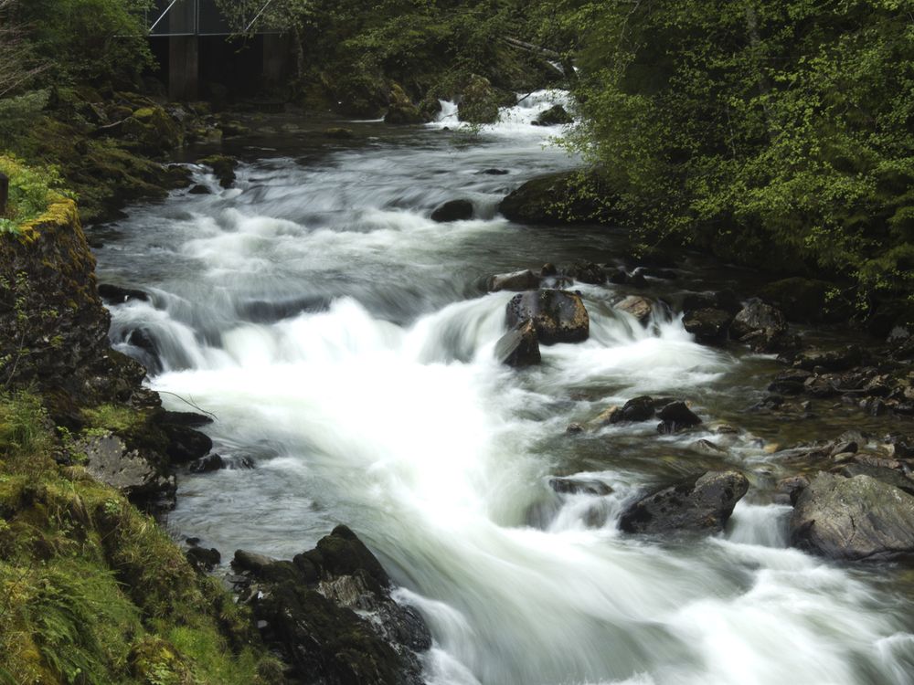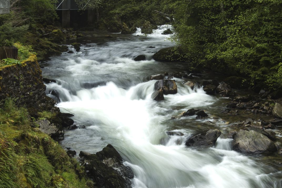 A long exposure of the Creek Street creek in Ketchikan, Alaska