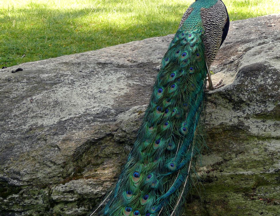 A look at a peacock with folded feathers at the Bronx zoo in Bronx, New York City.