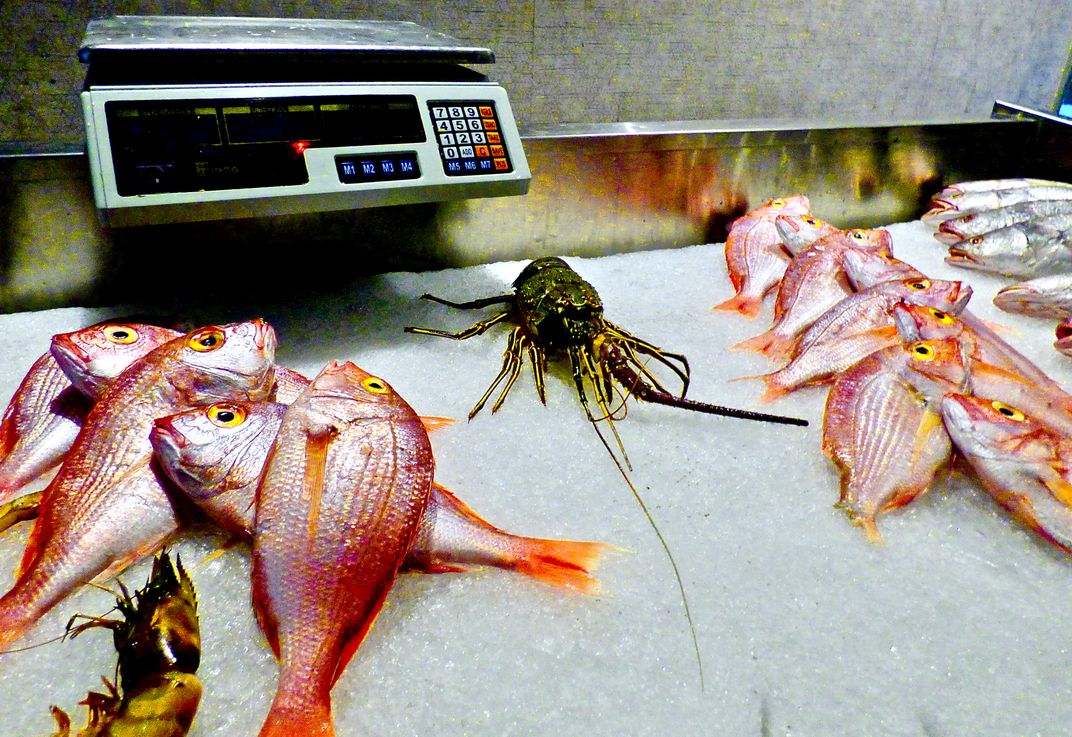 As my tour bus driver entered Abidijan, he drove me straight into the Treichville area with its ubiquitous fish markets. This market's product layout of neatly piled fish and crustaceans that seemed to know where they were going was especially appealing. All this on a bed of ice with a modern scale.