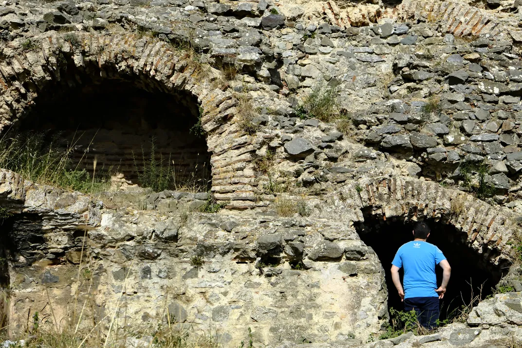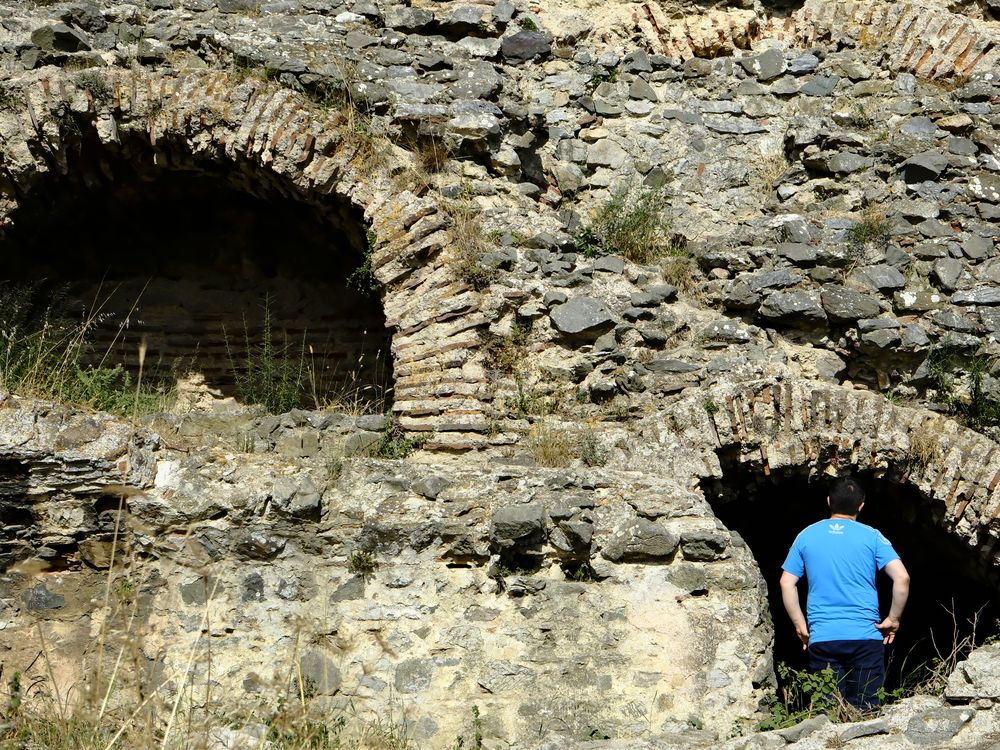 Standing at the mouth of the stone, dwarfed by its sheer weight and scale.