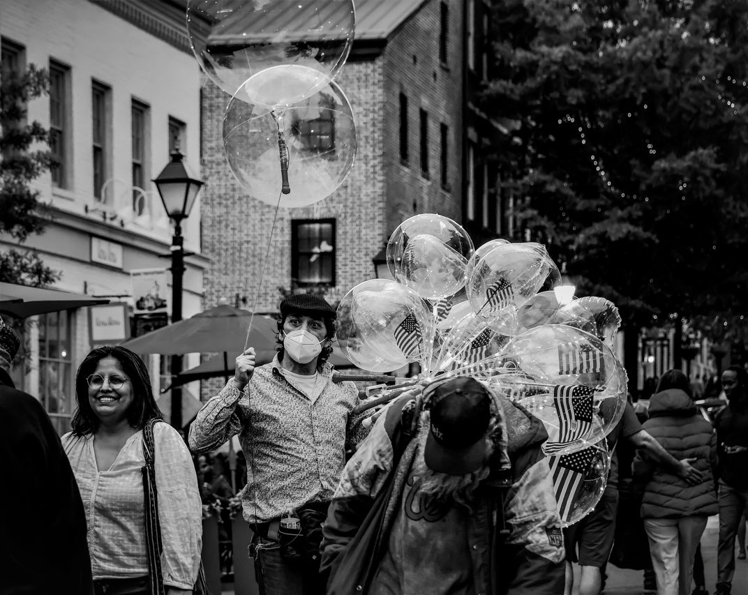 I came across a funny scene in front of a man selling balloons on the street. When he bent down, it looked as if he was carrying a heavy American flag.