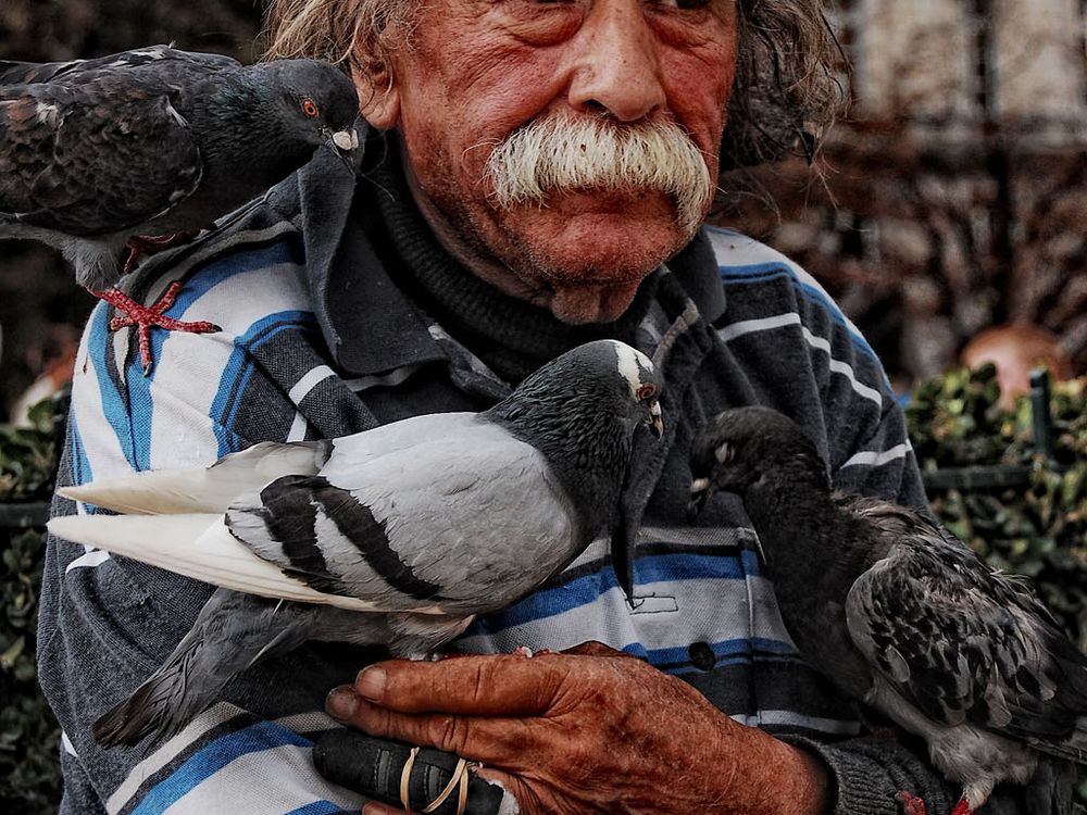 A man in fron of Notre Dame in Paris.With his little friends....