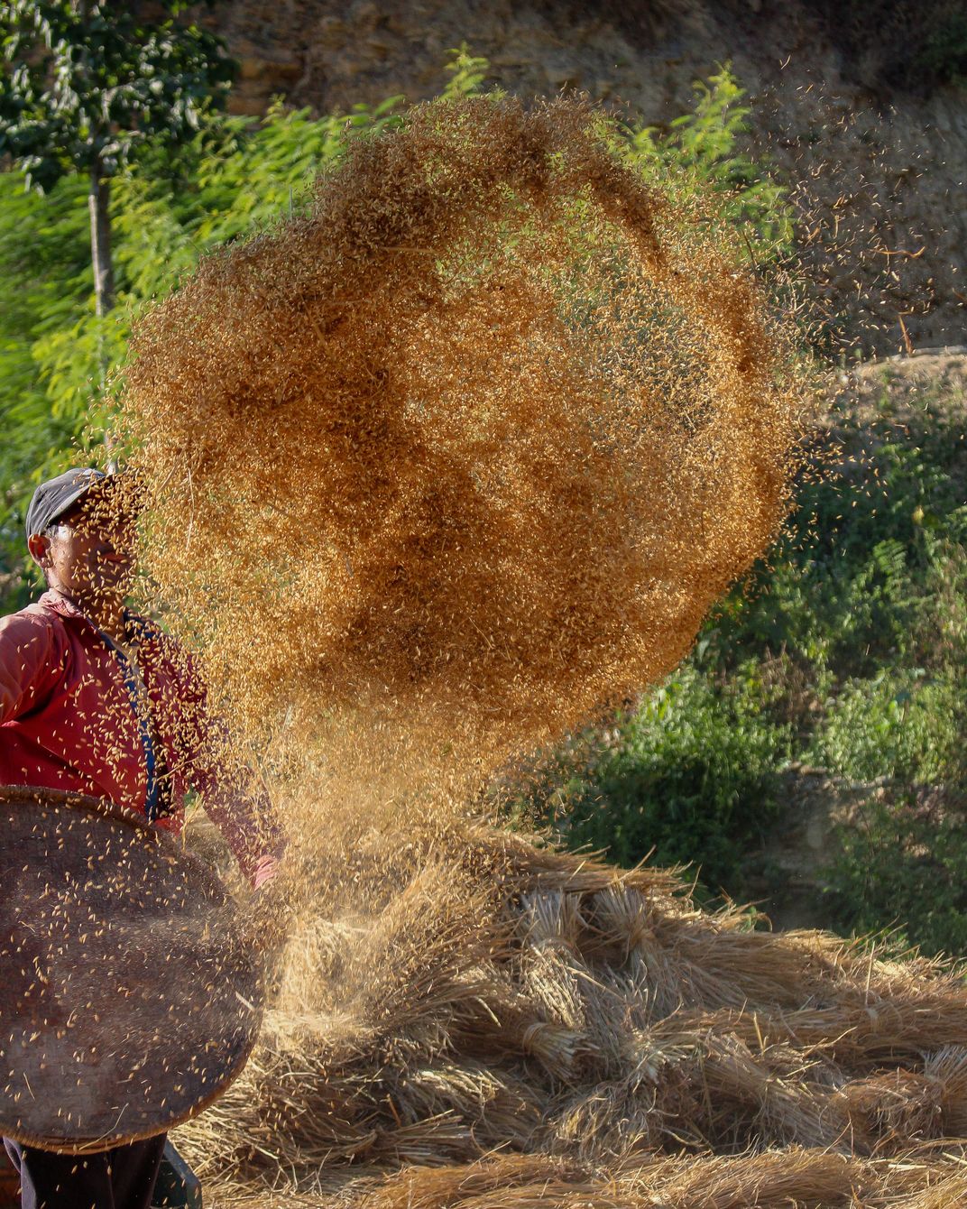 Winnowing is the process of separating chaff from grain. It is the traditional process which is carried out by farmers. In the photo, a person is throwing mixture into the air so that he can obtain clean grain as chaff gets carried out by air.