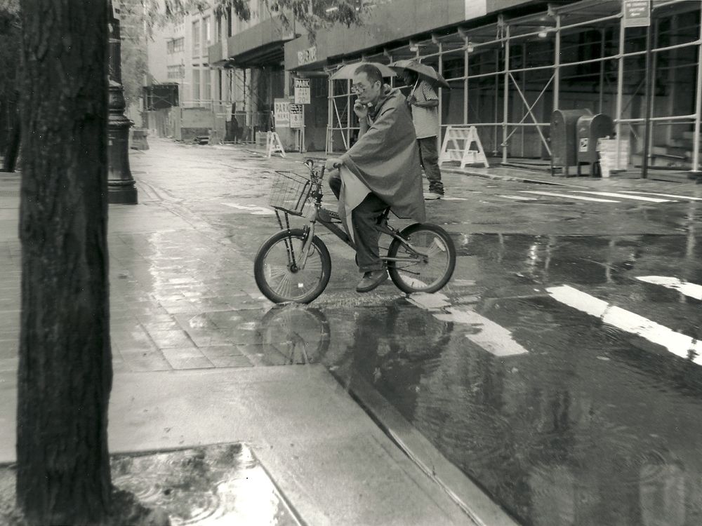A man rides his bike on a rainy day.